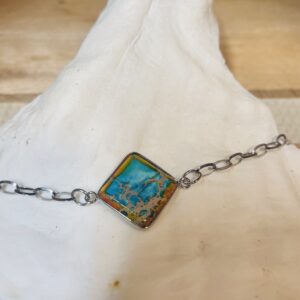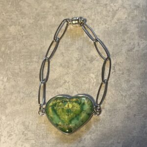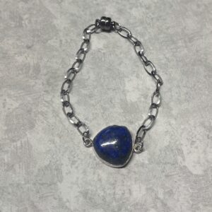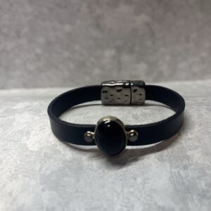 A moonstone set in silver riveted to black leather. Silver magnetic clasp for closure. Fits an 8 inch wrist.
